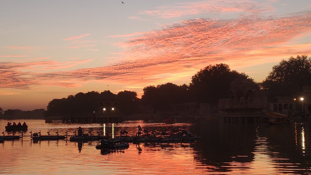 We requested Surender Ji to bring us to a local popular restaurant D-Desi, where we went (again) for Dal Bhaati and Rajashtani Thaali, incredible taste, but it was just too much food. We got dropped at the golden Haveli hotel, which looked great from the outside, but inside was crap. We went to Gadisar lake at 5:30pm, the lake was simply beautiful, nice sunset and great sky views, we saw vibrant colors of red, orange and dark blue hue, it was great experience.