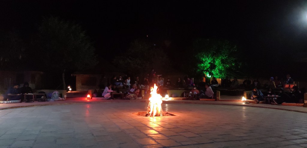 While walking around we bumped into Gajendra Singh, who checked on us if we were doing ok, nice of him. Interestingly, he mentioned there is a star gazing site at the edge of the resort. We walked there and yes it was brilliant. There was this small gate to get out of the resort and towards the real star gazing place in the desert, but we were bit afraid to go past here, came back and joined the bonfire dancing gang for a while. We again met Gajendra Singh, and had interesting conversations with him. He talked a lot about Rajasthani traditions – how people still got married young. He himself got married at the age of 16-17 years. The groom and bride are already chosen while kids. Things have been improving recently due to education. He told me how lucky I was to have a housemaker as wife, as most women are working these days. He is a Rajput, have to marry a different Rajput clan. Proudly said even science confirmed the gene pool gets better with such cross pollination. It was such a delight talking to him. We went back near the camp fire, and met some young folks, some working, some still studying.