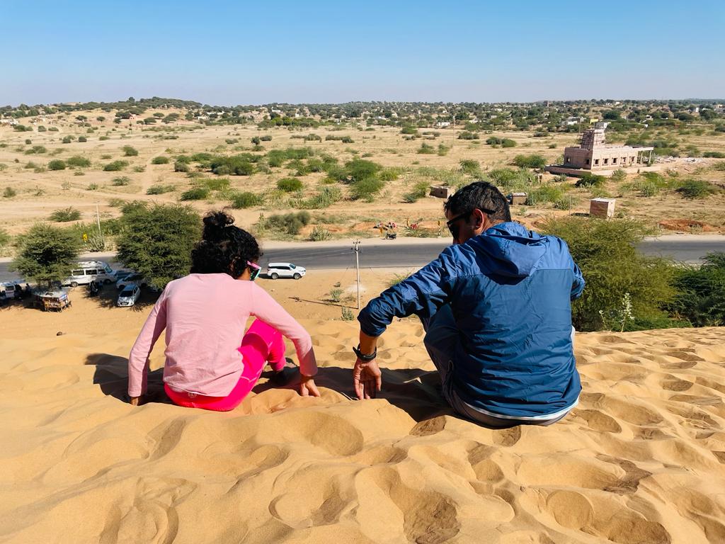On Day.2 of our Journey we hit the road at 10am, travelling from Jodhpur to Jaisalmer. Enroute we passed through Pokhran village, nothing special to look around, although legendary. My daughter kept asking when do we get to see the desert. Surender ji, our driver told there was this place called Dechu where we would stop to experience some sand. As promised, he stopped at this place, it was truly beautiful, a great welcome to the desert landscape. We walked up a small hill full of sand to get a nice view from the top and of-course play with the desert sand, quite refreshing!
