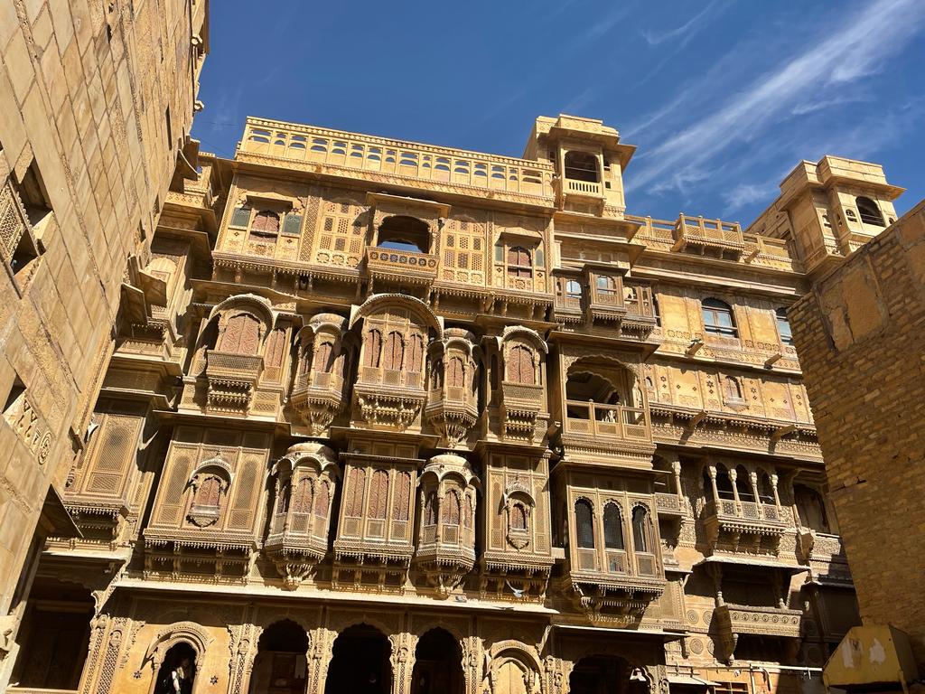 We bought some T-shirts, Rajasthani specific wood showpiece, and walked to another Haveli, called Munim Haveli. Anil explained it was built by two different architects, two halves that looked similar, but had minor differences, not easy to be spotted. Family still lived in this Haveli, they now sell stuff for a living. Anil explained how tourist season is only 6 months, remaining 6 months he works as a Line producer for movies and OTT shows, helping to book sights and take government permission, although he could muster only one or two per year. He then took us to a handloom shop, apparently owned by some popular lady who contested at KBC (she undertakes lot of social service). Quite pricey and touristy, we thought. We took auto and went to the main fort, Anil took us to Jain Mandir, walked around the homes, markets, nice restaurants with view. Finally, as it normally is the case with guides, he brought us to emporium, we bought one painting for Rs.1800/-, some memory of this place, we concurred.