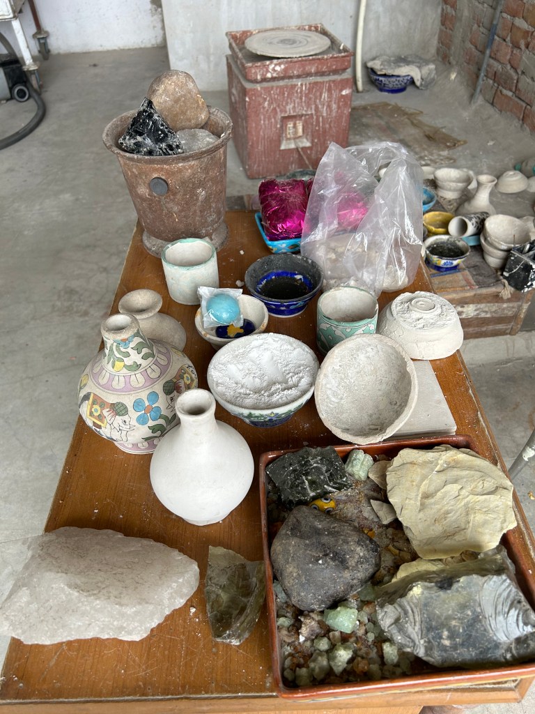 Grinded to fine white dust, made into a dough and transformed into respective shapes. Finally, it was baked in oven after painting. Originally sky-blue color was used, and hence the name blue pottery latched on. The darker blue shade came from Persia (Iran), and these days they have more colors. We bought some pottery items, which he would ship safely to our address in Bangalore. The whole experience of 2-3 hours was quite unique and nice.
